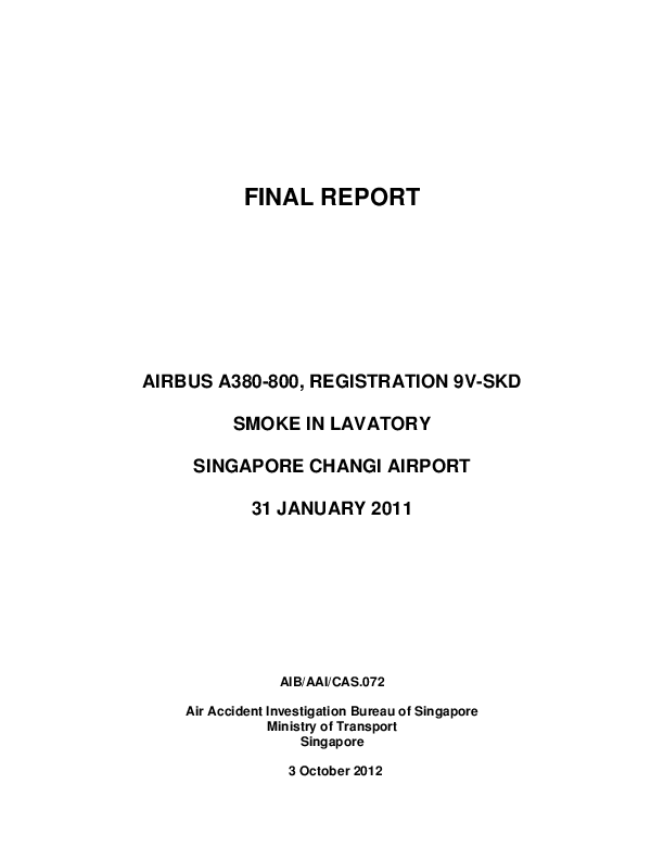 Final Report - A388 smoke in lavatory, 300NM NE from Singapore, 31 Jan 2011