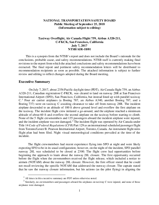 On 7 July 2017 the crew of an Airbus A320, cleared for an approach and landing on runway 28R at San Francisco in night VMC, lined up for the visual approach for which it had been cleared on the occupied parallel taxiway instead of the runway extended centreline and only commenced a go-around at the very last minute, having descended to about 60 feet agl whilst flying over two of the four aircraft on the taxiway. The Investigation determined that the sole direct cause of the event was the poor performance of the A320 flight crew.
