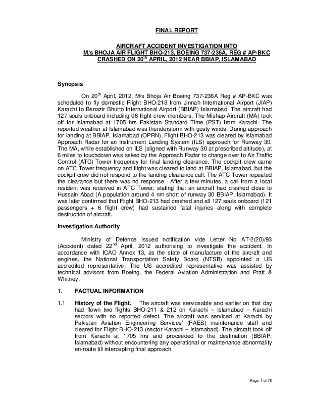 Final Report Aircraft Accident Investigation Into M/S Bhoja Air Flight BHO-213, Boeing 737-236A, Reg
