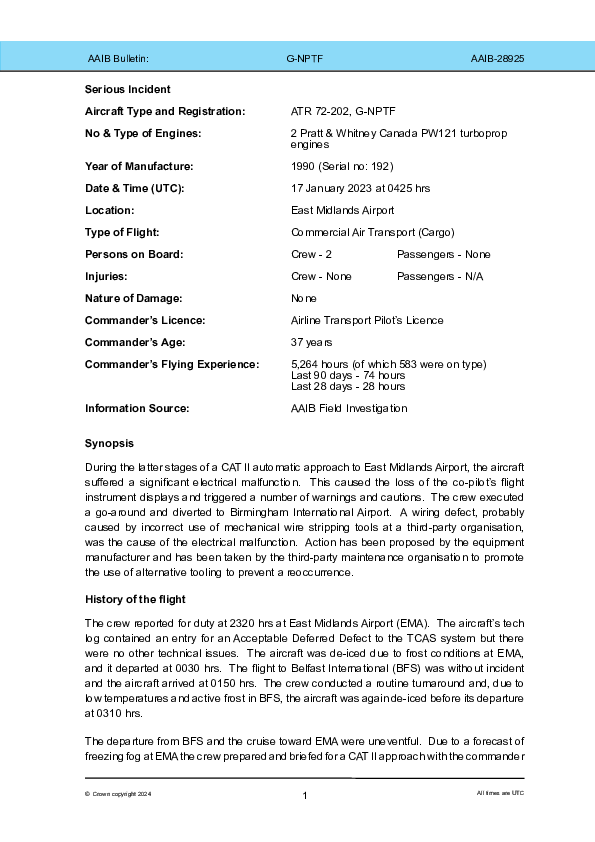 On 17 January 2023, an ATR 72-200 in the final stages of a CAT 2 ILS night approach to East Midlands experienced a significant electrical malfunction which disabled one set of primary flight instruments and triggered multiple system status indication failures. These included false system warnings and radio communications problems. The approach was discontinued, a MAYDAY declared and a successful manually-flown diversion to Birmingham was then made. The cause of the electrical malfunction was found to be a wiring defect which was considered to have probably been caused by the incorrect use of mechanical wire stripping tools during third party maintenance.