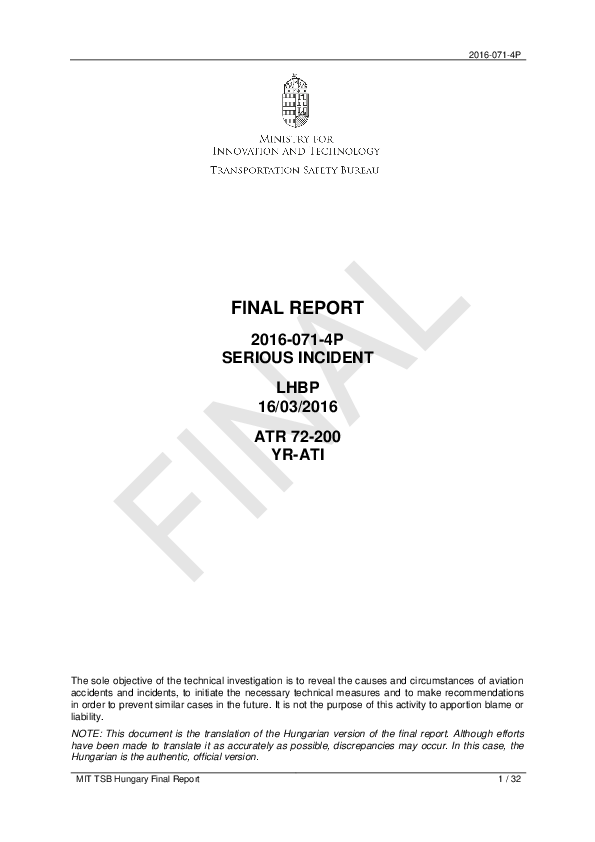 Final Report AT72 (YR-ATI) vicinity Budapest Hungary, 16 Mar 2016