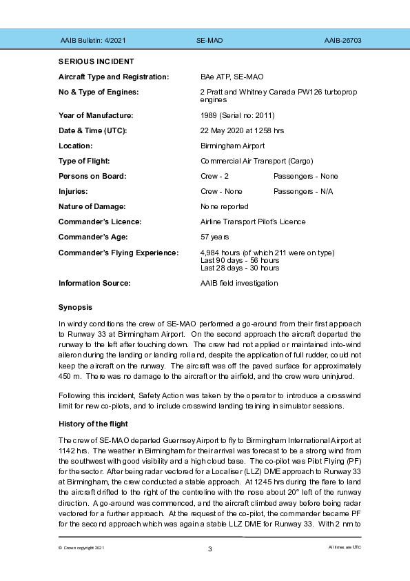 On 22 May 2020, a BAe ATP made a go around after the First Officer mishandled the landing flare at Birmingham and when the Captain took over for a second approach, his own mishandling of the touchdown led to a lateral runway excursion. The Investigation found that although the prevailing surface wind was well within the limiting crosswind component, that component was still beyond both their handling skill levels. It also found that they were both generally inexperienced on type, had not previously encountered more than modest crosswind landings and that their type training in this respect had been inadequate.