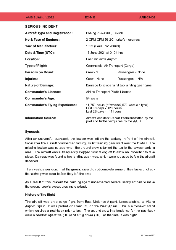 On 16 June 2021, a Boeing 737-400 was taxiing for departure at night after push back from stand when the ground crew who completed the push back arrived back at their base in the tug and realised that the tow bar they had used was not attached to it. The aircraft was prevented from taking off and it was then found that it had taxied over the unseen towbar and sustained damage to both nose gear tyres such that replacement was necessary. The Investigation concluded neither ground crew had checked that the area immediately ahead of the aircraft was clear.