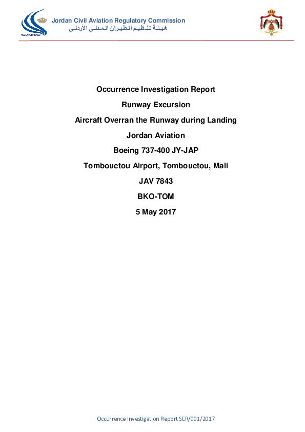 On 5 May 2017, a Boeing 737-400 made a visual approach to Timbuktu and slightly overran the end of the 2,170 metre-long runway into soft ground causing one of the engines to ingest significant quantities of damaging debris. The Investigation found that the landing had been made with a significantly greater than permitted tailwind component but that nevertheless had the maximum braking briefed been used, the unfactored landing distance required would have been well within that available. The preceding approach was found to have been comprehensively unstable throughout with no call for or intent to make a go around.