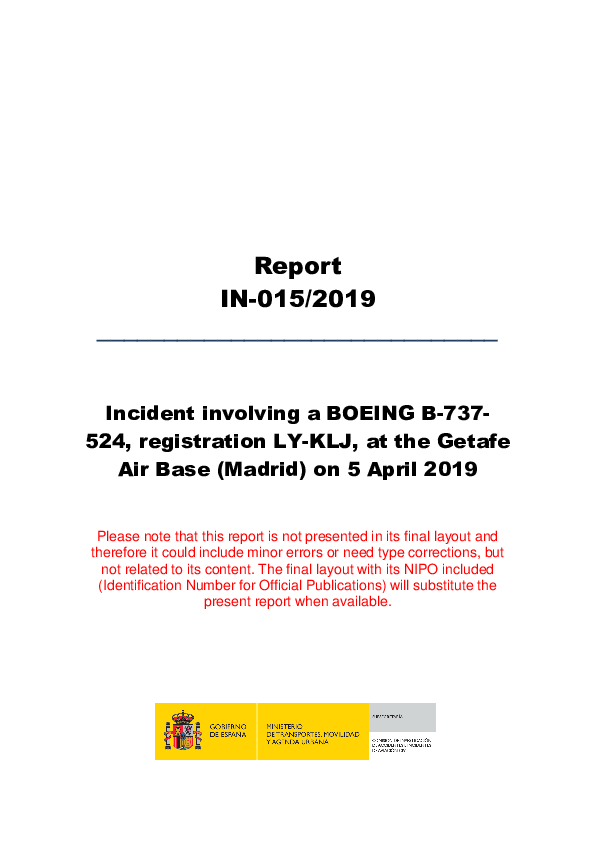 Final Report B735 (LY-KLJ) vicinity Madrid Barajas Spain, 5 April 2019