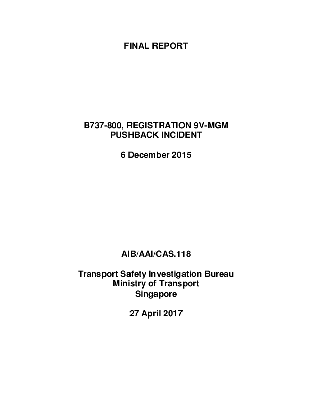 Final Report B738 (9V-MGM) Pushback Incident Singapore 6 Dec 2015