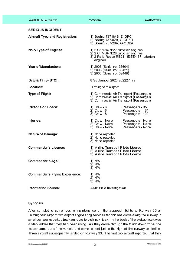 On 8 September 2020, an airport maintenance team driving at night on the centreline of the active runway at Birmingham were unaware that an inadequately secured 2 metre-long ladder had fallen from their pickup truck. Three aircraft then landed in the following half hour narrowly missing the ladder before it was discovered and the runway closed. The Investigation found that a more suitable alternative vehicle was available and that the completely inadequate method used to secure the ladder in their vehicle had failed to restrain it when the vehicle accelerated after passing the aiming point markings in the touchdown zone.
