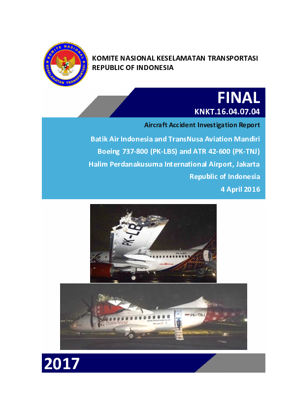 Final Report B738 (PK-LBS) & AT46 (PK-TNJ) RI Collision at Jakarta Halim Indonesia, 4 Apr 2016