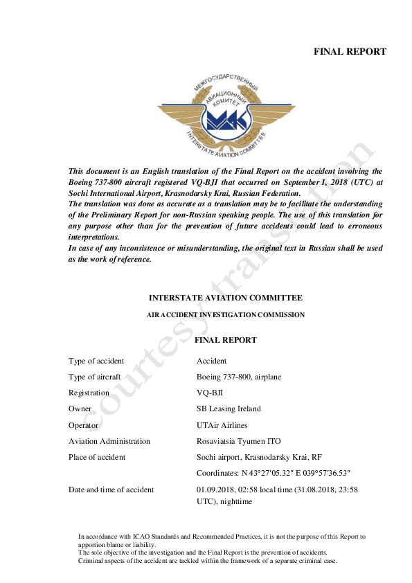 Final Report B738 (VQ-BJI), Sochi Russia, 1 Sep 2018