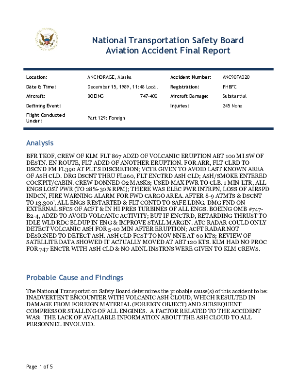 On 15 December 1989, a Boeing 747-400 positioning for a planned en-route stop at Anchorage with crew awareness of a significant volcanic eruption in progress some 150 nm upwind entered volcanic ash during descent north northeast of the airport. When an attempt to climb out of the ash using full thrust was made, all engines failed. After repeated and eventually successful engine restart attempts as a 13,000 feet loss of altitude occurred, the fight was completed. The Report of the comprehensive NTSB Investigation remains unpublished with only a brief factual report containing neither Safety Recommendations nor Safety Actions issued.