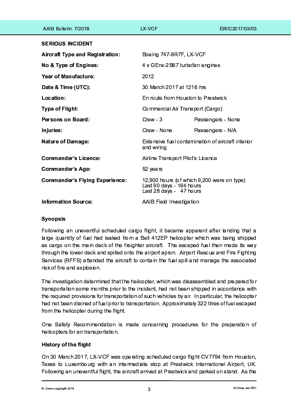 On 30 March 2017, a Boeing 747-8F]] (LX-VCF) being operated by Cargolux on a scheduled cargo flight from Houston to Luxembourg via Prestwick as CV7754 was found to be Fuel - leaking significant quantities of aviation fuel from the lower fuselage as soon as it reached its allocated parking position at Prestwick in normal daylight visibility. The source of the fuel was found to be a helicopter on board as part of the main deck cargo. The Airport Rescue and Fire Fighting Services were called and contained the fuel spill and managed the associated risk of fire and explosion.