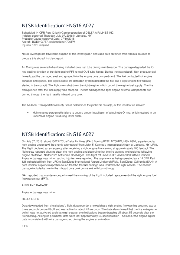 On 7 July 2016, a right engine fire warning was annunciated as a Boeing 757-200 got airborne from New York JFK and after shutting the engine down in accordance with the corresponding checklist, an emergency declaration was followed by an immediate and uneventful return to land. After an external inspection confirmed there was no sign of an active fire, the aircraft was taxied to a terminal gate for normal disembarkation. The Investigation found that a fuel-fed fire had occurred because an O-ring had been incorrectly installed on a fuel tube during maintenance prior to the flight.