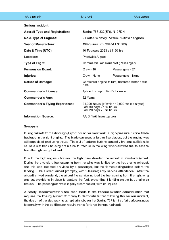 On 10 February 2023, a Boeing 767-300ER had problems setting climb thrust after takeoff from Edinburgh and a right engine control fault was annunciated. It was decided that the intended transatlantic flight should divert to Prestwick. Right engine vibration became apparent and it was set to idle and shutdown after landing. On arrival at the assigned parking position, fuel was seen leaking from the right wing and a rapid passenger disembarkation was completed. Engine imbalance after turbine blade fracture was found to have caused the fuel leak and a risk of more potentially serious consequences after this scenario was identified.
