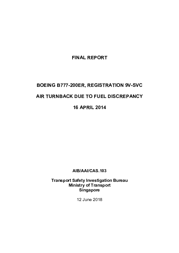 On 16 April 2014, a pre-flight concern about whether a Boeing 777-200ER about to depart Singapore had been overfuelled was resolved by a manual check but an en-route fuel system alert led to close monitoring of the fuel system. When a divergent discrepancy between the two independent fuel remaining sources became apparent, an uneventful precautionary air turnback was made and overfuelling subsequently confirmed. The Investigation found that a system fault had caused overfuelling and that the manual check carried out to confirm the actual fuel load had failed to detect it because it had been not been performed correctly.