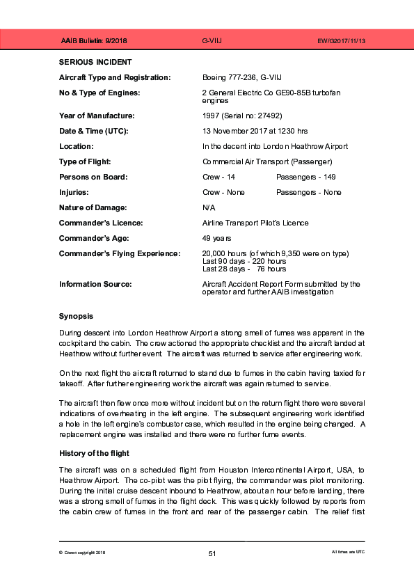 On 13 November 2017, fumes on a GE90-powered Boeing 777-200 sufficient to require flight crew oxygen mask use occurred as it descended towards London Heathrow. The flight was completed without further event. Subsequent engineering assessments twice led to release to service followed by recurrence and after the fourth such release, a left engine overheat was annunciated. After flight, a hole in the engine combustor case was found and the engine was removed for repair. The Investigation attributed the delayed identification of the causal fault to inappropriate guidance in the aircraft manufacturers Fault Isolation Manual which was has since been amended.