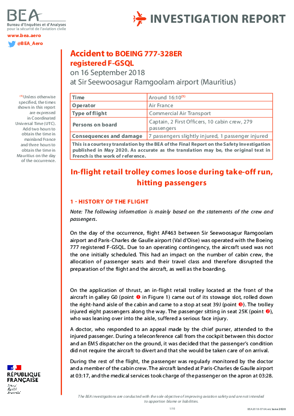 On 16 September 2018, a Boeing 777-300 was beginning its takeoff from Mauritius when an inadvertently unsecured cabin service cart left its stowage in the forward galley area and travelled at increasing speed towards the rear of the cabin injuring several passengers before it stopped after meeting an empty seat towards the rear of the cabin. The Investigation noted that cabin crew late awareness of an abnormal aircraft configuration and its consequences had led to them generally prioritising service delivery over safety procedures prior to takeoff with this then leading to an overlooked safety task not being detected.