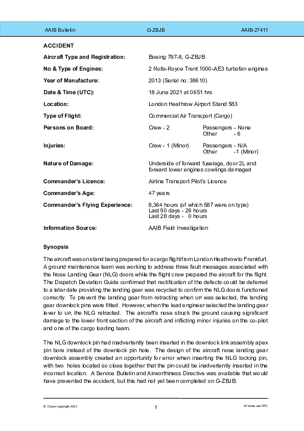 On 18 June 2021, a Boeing 787-8 being operated by British Airways was being loaded for a cargo flight at Heathrow whilst line engineering carried out checks required to permit despatch with a deferred minor defect for later rectification. The check required cycling the landing gear with locking pins inserted so that only the bay doors cycled but when this was done, the nose gear retracted and the front of aircraft dropped to the ground causing significant damage to the airframe and minor injuries to two people. The nose gear downlock pin had inadvertently been inserted into the wrong hole.