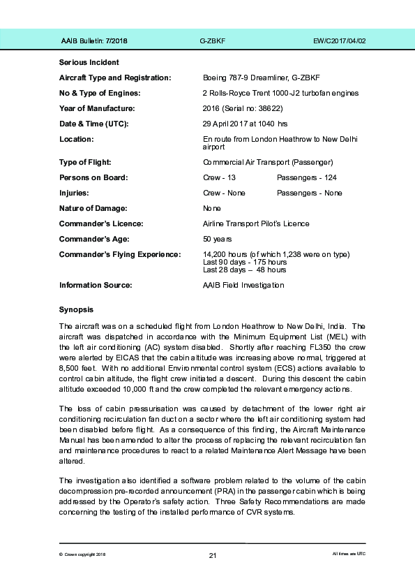 On 29 April 2017, a Boeing 787-9 which had just reached cruise altitude after despatch with only one main ECS available began to lose cabin pressure. A precautionary descent and PAN was upgraded to a rapid descent and MAYDAY as cabin altitude rose above 10,000 feet. The Investigation found that aircraft release to service had not been preceded by a thorough enough validation of the likely reliability of the remaining ECS system. The inaudibility of the automated announcement accompanying the cabin oxygen mask drop and ongoing issues with the quality of CVR readout from 787 crash-protected recorders was also highlighted.