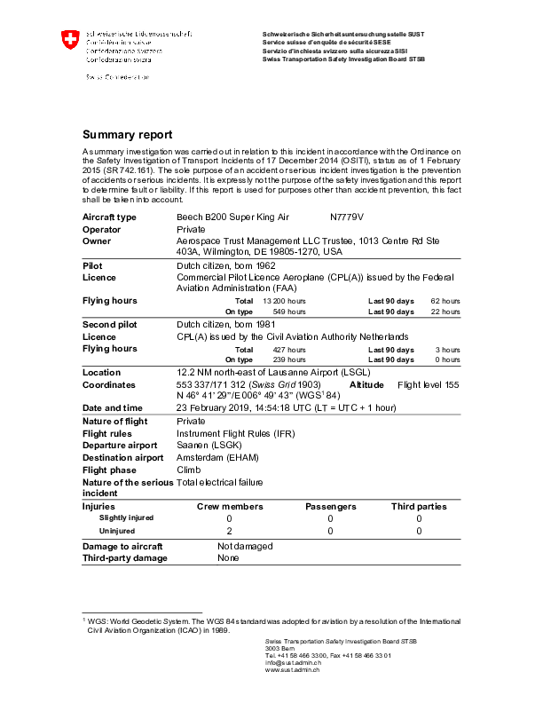 Final Report BE20 (N7779V)), en-route near Lausanne Switzerland, 23 February 2019