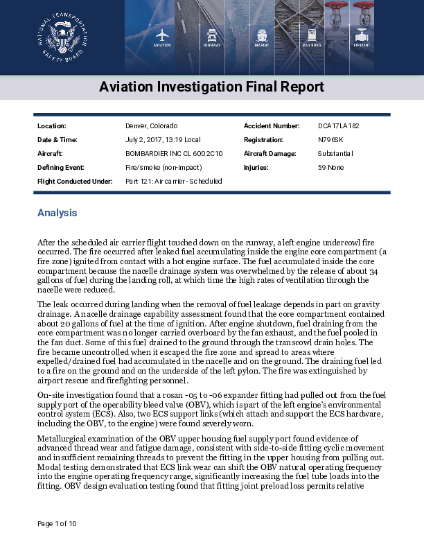 On 2 July 2015, the left engine of a Bombarier CRJ 700A exiting the runway after landing at Denver caught fire and continued burning after the aircraft had been stopped on the taxiway and the engine shut down. The Investigation found that the fuel supply to the fuel-operated engine performance valve had failed and the quantity of fuel which then leaked had overwhelmed the engine cowl drain capacity and ignited. A history of similar failures was found and this one resulted in the introduction of additional mandatory in-serviced checks pending the replacement of the valve concerned with an improved design.