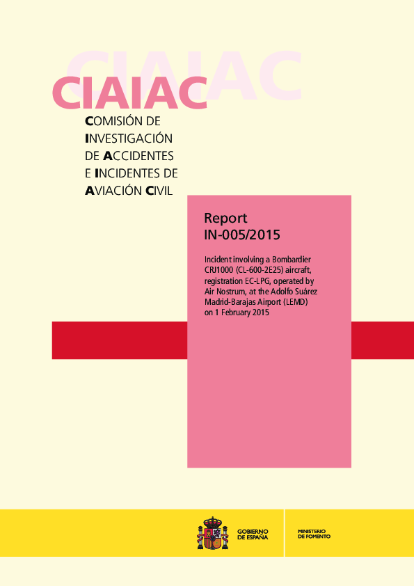 On 1 February 2015, a Bombardier CRJ 1000 departed from Pamplona with slush likely to have been in excess of the regulatory maximum depth on the runway. On landing at Madrid, the normal operation of the brake units was compromised by ice and one tyre burst damaging surrounding components and leaving debris on the runway, and the other tyre was slow to spin up and sustained a serious flat spot. The Investigation concluded that the Pamplona apron, taxiway and runway had not been properly cleared of frozen deposits and that the flight crew had not followed procedures appropriate for the prevailing conditions.