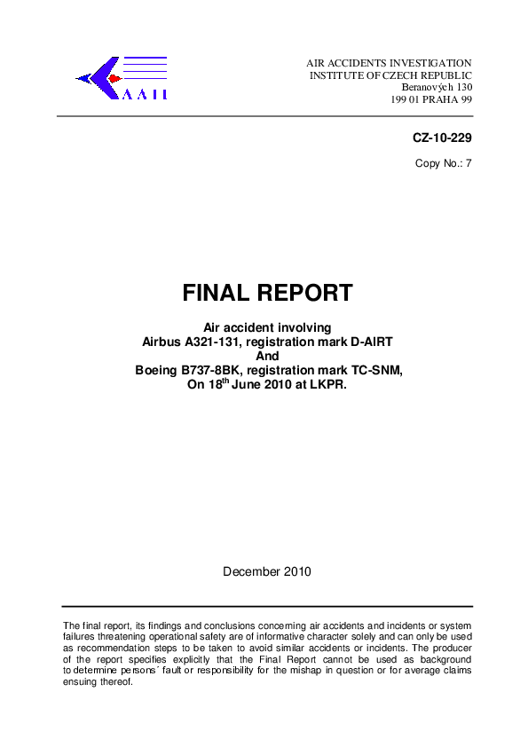 Final Report CZ-10-229, Taxiway collision A321 and B738, Prague Czech Republic