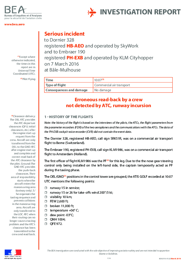 Final Report E190 (PH-EXB) & D328 (HB-AEO), Basel Mulhouse France, 2016
