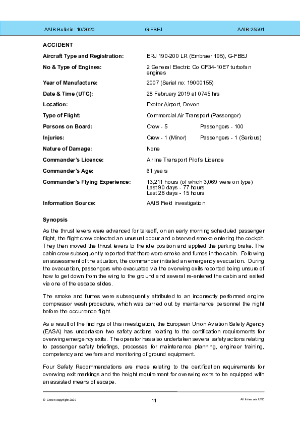 On 28 February 2019, an Airbus A320 abandoned takeoff from Exeter when fight deck fumes/smoke accompanied thrust applied against the brakes. When informed of similar conditions in the cabin, the Captain ordered an emergency evacuation. Some passengers using the overwing exits re-entered the cabin after becoming confused as to how to leave the wing. The Investigation attributed the fumes to an incorrectly-performed engine compressor wash arising in a context of poorly-managed maintenance and concluded that guidance on overwing exit use had been inadequate and that the 1.8 metre certification height limit for exits without evacuation slides should be reduced.