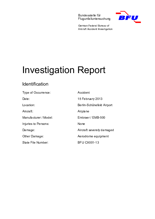 On 15 February 2013, an Embraer EMB-500 Phenom 100 crew lost control of their aircraft shortly before touchdown at Berlin Schönefeld when it stalled and crash-landed. The Investigation was not completed for almost six years but concluded that the stall was a result of ice accretion during an approach in icing conditions without activation of the airframe de icing system. It found poor crew awareness of both the ice and stall protection systems and, suspecting that this may be true of other type-rated pilots, accordingly made Safety Recommendations to key regulatory authorities concerning the type rating syllabus.