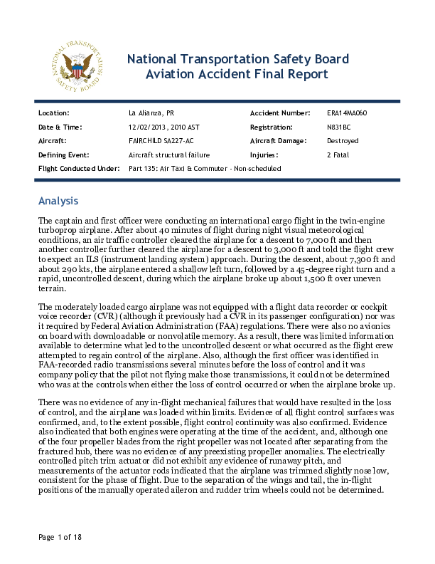 On 2 December 2013, an SA227 Freighter crew lost control of their aircraft after commencing descent from an 11,000 feet cruise in night VMC and it was destroyed by terrain impact which followed structural break-up at about 1,500 feet agl. The Investigation concluded that the break-up had followed an aggressive elevator input in a late attempt to recover from an earlier loss of control which the evidence suggested had been the consequence of unintended crew actions rather than mechanical anomalies. A number of previous SA227 loss of control events were identified, some of which had potentially similar features.