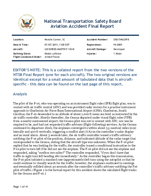 Final Report F16 C150 Mid-Air Collision, vicinity Berkeley County SC USA, 7 July 2015
