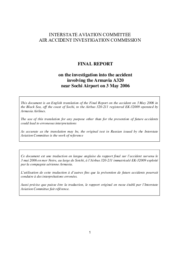FINAL REPORT on the investigation into the accident involving the Armavia A320 near Sochi Airport on