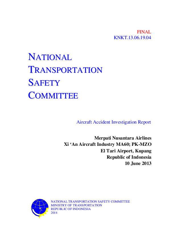 Final Report, KNKT.13.06.19.04, Merpati Nusantara Airlines, MA60 accident, El Tari, Indonesia, 2013