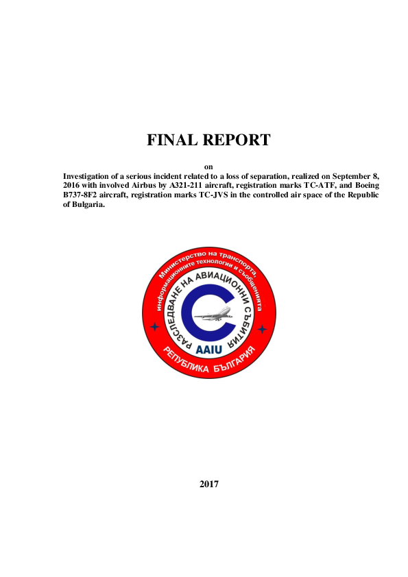 Final Report LOS A321 (TC-ATF) & B738 (TC-JVS) south eastern Bulgaria, 8 Sept 2016