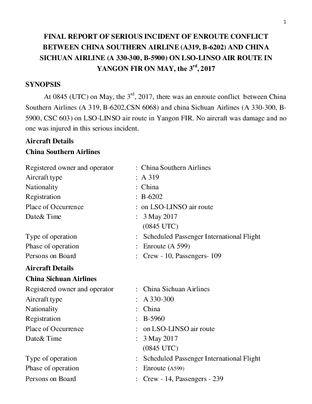 At 0845 (UTC) on May, the 3rd, 2017, there was an enroute conflict between China Southern Airlines (A 319, B-6202,CSN 6068) and china Sichuan Airlines (A 330-300, B- 5900, CSC 603) on LSO-LINSO air route in Yangon FIR. No aircraft was damage and no one was injured in this serious incident.