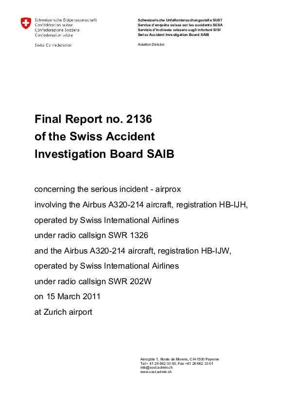 Final Report no. 2136, Serious incident (Airprox), Zurich Airport, 15 March 2011