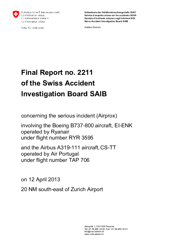 Final Report no. 2211 concerning the serious incident (Airprox) involving B738 and A319, Switzerland