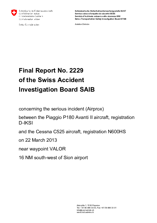 Serious incident (Airprox)between the Piaggio P180 Avanti II aircraft, registration D-IKSI and the Cessna C525 aircraft, registration N600HS on 22 March 2013 near waypoint VALOR, 16 NM south-west of Sion airport
