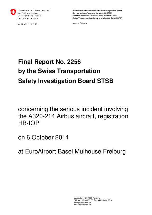 Final Report No. 2256 serious incident A320 (HB-IOP) Basel Mulhouse France 6 Oct 2014