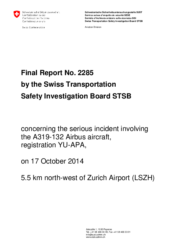 Final Report No. 2285 A319 (YU-APA) vicnity Zurich Switzerland, 17 Oct 2014
