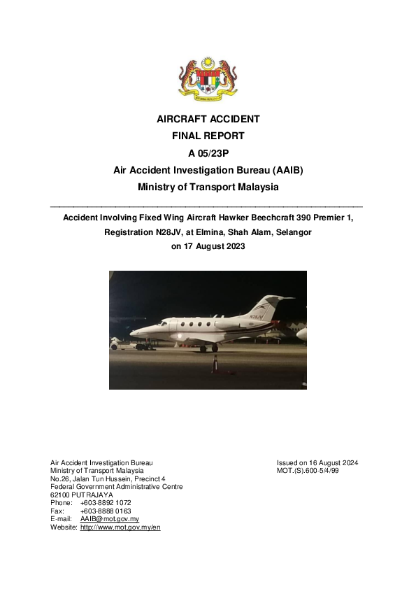 On 17 August 2023, a privately operated Hawker Beechcraft 390 Premier 1 on final approach to Subang suddenly departed controlled flight in benign weather conditions and crashed. The aircraft was destroyed by the impact and post crash fire and the eight occupants and two persons on the ground were killed. Control of the aircraft was lost after the aircraft lift dump spoilers were inadvertently deployed. The context for this inappropriate action was found to have been deviations from standard operating procedures, inadequate pilot training, regulatory grey areas and deficiencies in communication and decision-making between the two pilots during the flight.