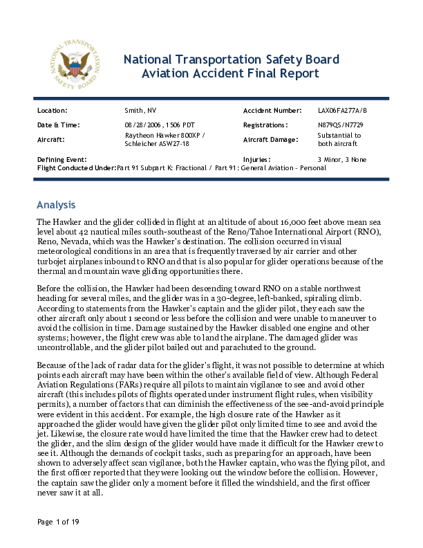 Final Report Raytheon Hawker 800XP / Schleicher ASW27-18 Collision near Smith NV USA, 28 Aug 2016