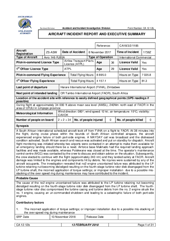 On 8 November 2017, an Avro RJ85 in the cruise after just crossing into South African airspace from Zimbabwe suddenly experienced the apparently simultaneous failure of both left hand engines. After reviewing their situation, it was decided to continue to Johannesburg and this was achieved without further event. The Investigation found that the initiating failure was that of the number 2 (inner) engine which failed mechanically as a consequence of maintenance error but that this failure was uncontained and turbine debris from the number 2 hit the number 1 engine FADEC box and caused that engine to shut down too.