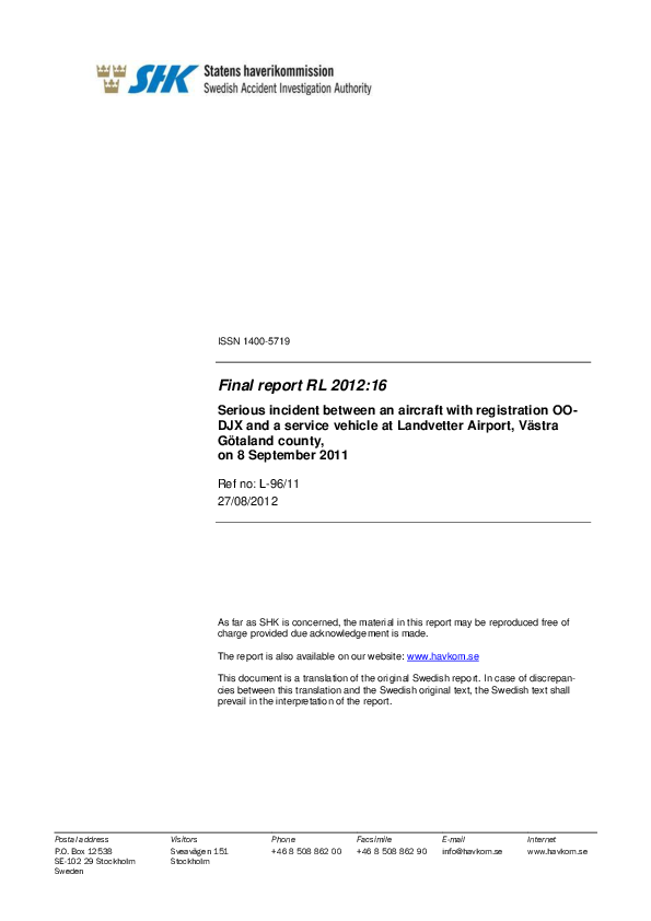 On 8 September 2011, a Brussels Airlines Avro RJ85 on the take off roll at Gothenburg came close to collision with a vehicle which the subsequent investigation found had been issued with clearance to enter the same runway as a result of controller error in the context of non-essential conversation. The vehicle saw the approaching aircraft just before entering the runway and stopped just clear of the runway approximately 40 metres ahead of the point at which it became airborne.