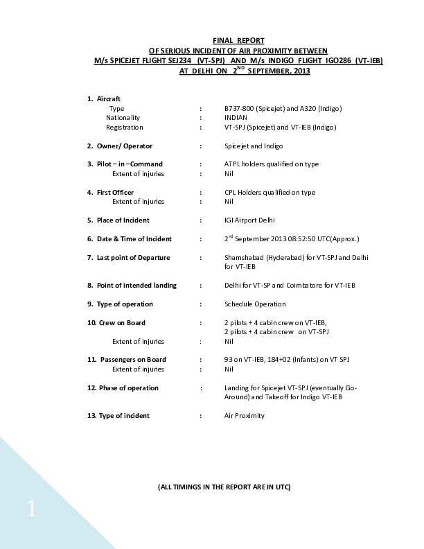 Final Report of Serious Incident of Air Proximity Between M/s Spicejet Flight SEJ234 (VT-SPJ) and M/s Indigo Flight IGO286 (VT-IEB) at Delhi on 2nd September, 2013