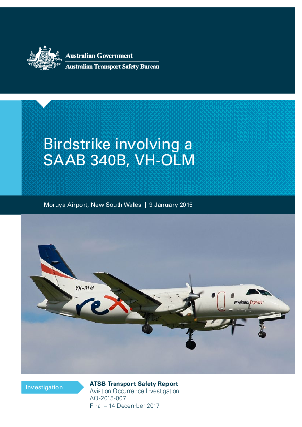 On 9 January 2015, a Saab 340B encountered a flock of medium-sized birds soon after decelerating through 80 knots during its landing roll at Moruya. A subsequent flight crew inspection in accordance with the prevailing operator procedures concluded that the aircraft could continue in service but after completion of the next flight, a propeller blade tip was found to be missing. The Investigation concluded that the blade failure was a result of the earlier bird impact and found that airline procedures allowing pilots to determine continued airworthiness after a significant birdstrike had unknowingly been invalid.