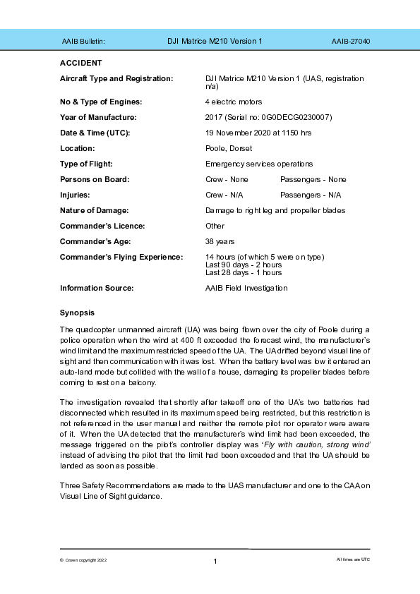 On 19 November 2020, the police operator of a DJ Matrice M210 UA lost control of it over Poole when it drifted beyond Visual Line Of Sight (VLOS) and communication ceased. It was subsequently damaged when colliding with a house in autoland mode. The Investigation found that a partial power failure had followed battery disconnection with its consequences not adequately communicated to the pilot. It faulted both the applicable UA User Manual content and the absence of sufficient UA status and detected wind information to the pilot. A failure to properly define VLOS was identified but not considered directly causal.