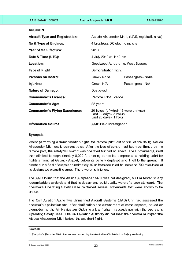On 4 July 2019, the operator of an Alauda Airspeeder UAV lost control of it and it climbed to 8000 feet into controlled airspace at a designated holding pattern for London Gatwick before falling at 5000 fpm and impacting the ground close to housing. The Investigation was unable to establish the cause of the loss of control but noted that the system to immediately terminate a flight in such circumstances had also failed, thereby compromising public safety. The approval for operation of the UAV was found to been poorly performed and lacking any assessment of the airworthiness of the UAS.