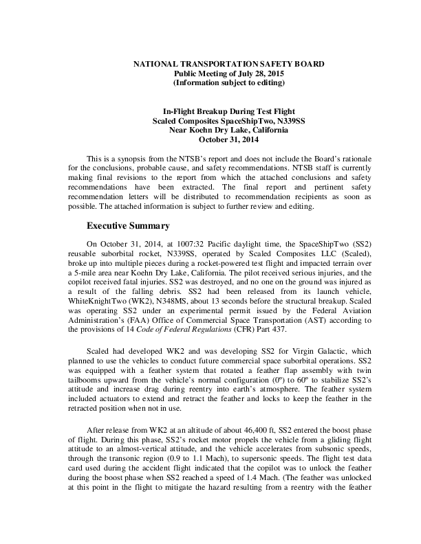 In-Flight Breakup During Test Flight Scaled Composites SpaceShipTwo, N339SS Near Koehn Dry Lake, Cal
