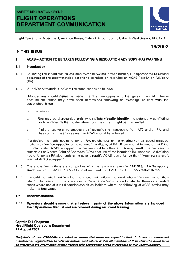 FODCOM 1902 ACAS - Action to be taken following an RA warning